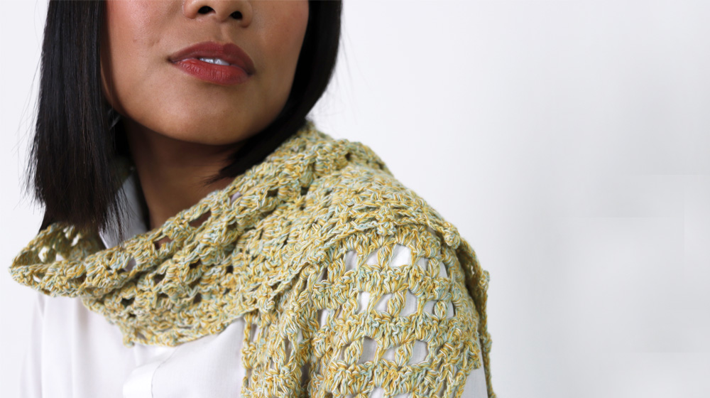 Le righe dalla 16 alla 21 impostano la lavorazione a punto rete fantasia con aumenti. Ripetetele per altre 11 volte, arrivando alla riga 87: nel seguire la sequenza delle righe con gli aumenti progressivi, tenete presente che i gruppi di 3 maglie alte sono sempre allineati in verticale e accoppiati a 2 a 2 con 1 maglia alta lavorata nella maglia bassa di base in orizzontale; tenete invece presente che tra 1 arco di 3 catenelle e il seguente si alternano sempre – sia in verticale sia in orizzontale – 1 maglia bassa lavorata nello spazio tra 2 gruppi di 3 maglie alte e 1 nocciolina lavorata nella maglia alta. Arrivati alla riga 87, siete a metà della sciarpina. Ora, proseguite in modo simmetrico, ovvero ripetete sempre le righe dalla 16 alla 21 per l’impostazione del punto, ma senza eseguire l’aumento alla fine della ripetizione di ogni riga 21; allo stesso tempo, diminuite 1 motivo sullo stesso lato degli aumenti nella seconda riga dopo l’ultimo aumento e a seguire ogni 6 righe fino ad arrivare alla riga 172 con 10 maglie alte: per diminuire 1 motivo, a inizio riga lavorate 3 catenelle chiuse insieme con la maglia che segue il primo motivo completo, che andrà saltato. Proseguite a maglia alta per 4 righe; allo stesso tempo, diminuite sullo stesso lato delle diminuzioni precedenti 2 maglie nelle prime 2 righe e 1 maglia nelle ultime 2 righe, arrivando alla riga 176 con 4 maglie alte: per diminuire 2 maglie lavorate 3 maglie alte chiuse insieme, per diminuire 1 maglia lavorate invece 2 maglie alte chiuse insieme. Nella riga seguente, lavorate 4 maglie alte chiuse insieme, poi chiudete il lavoro.