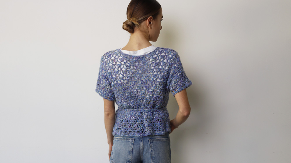 per la taglia S, sul davanti destro con l’uncinetto n° 4 EU / G-6 US eseguite 3 righe a maglia alta lungo il lato del fianco, partendo dal basso e procedendo per 24 cm / 9.4". Lavorate sul davanti sinistro nello stesso modo. Cucite le spalle e chiudete i fianchi. Lavorate le maniche esattamente come indicato per la taglia M, ma eseguendo 20 archi di catenelle separati da 1 maglia bassa nel giro 1.