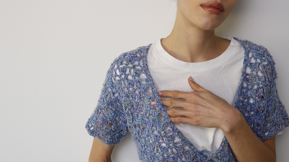 Un progetto per chi sa giŕ lavorare a uncinetto, prima si lavora il davanti e il dietro, poi si cuciono e infine si aggiungono le maniche. La cintura per stringere lo scaldacuore č realizzata con il mulinetto (o tricotin). Un punto traforato rende romantico, questo scaldacuore morbido e leggero, realizzato con il filato fantasia Vivienne.