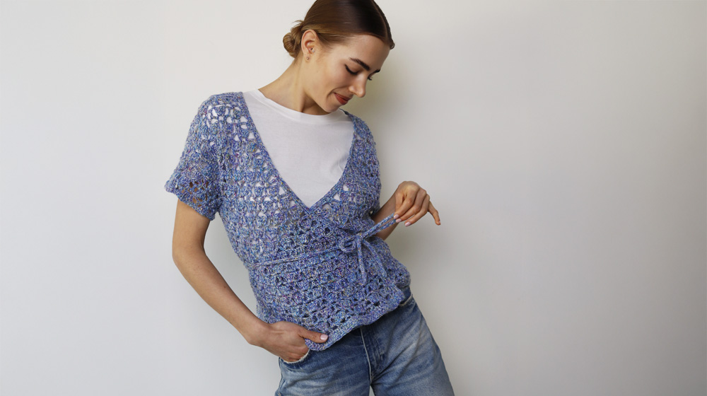 Il top incrociato č formato da 5 pezzi: il dietro e i davanti lavorati in piano, le maniche lavorate in tondo attorno agli scalfi. Tutti i bordi sono lavorati successivamente. La spiegazione che segue č data solo per la taglia M: per le taglie S e L segue una spiegazione sintetica per adattare catenelle di avvio, righe totali e diminuzioni per scollo e spalle.