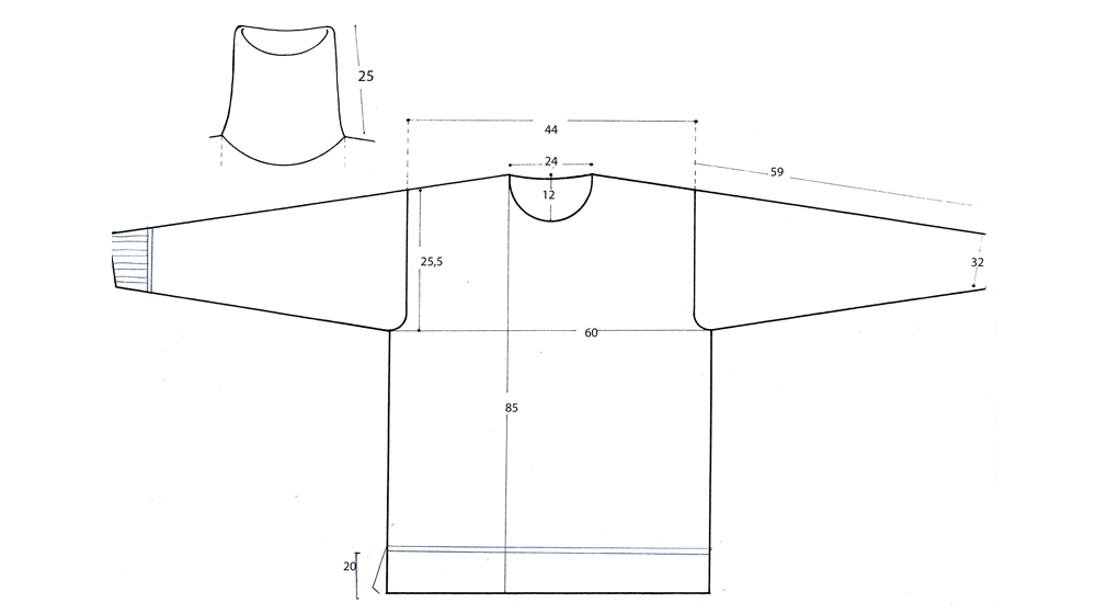 Tagliate l'etamina di lana seguendo il cartamodello (in taglia M) sottostante. Questa sarà la base del vostro Maxi Pull.