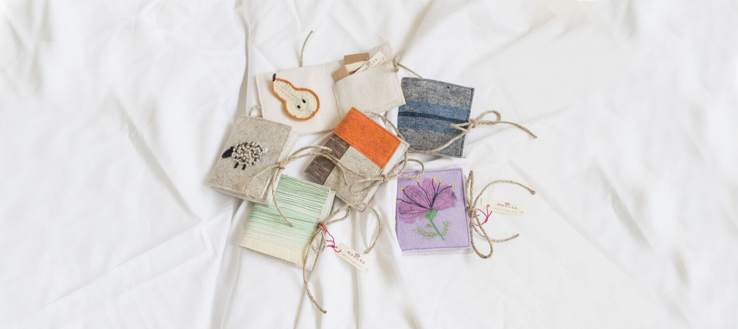 I Kit per il Cucito che vedete in queste foto sono proprio realizzati con rimasugli di feltro termoformabile, tops di seta Tussah e lana merino extrafine DHG. Grazie alla bravura delle artigiane di Manusa niente va sprecato e i nostri materiali vengono trasformati in piccole opera d'arte quotidiana. Il risultato potete vederlo nelle immagini: deliziosi Kit per il Cucito che aspettano solo di essere messi in qualche borsetta ed essere tirati fuori al bisogno! Un bottone si è staccato dal cappotto e state per affrontare un colloquio di lavoro? Un pezzetto di fodera della giacca si è allentato e siete in aeroporto in attesa della chiamata al gate? Al pupazzetto di vostra figlia si è staccato un occhio proprio cinque minuti prima della partenza per l'asilo? Questi sono i progetti che ci piacciono: quelli capaci di creare connessioni tra realtà apparentemente diverse, quelli che danno vita a prodotti belli, funzionali e che sanno di buono.