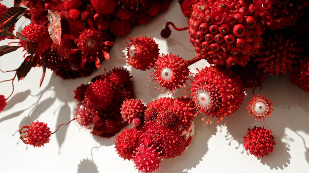 Spora è il primo lavoro da me realizzato che è pensato per stare in relazione alla stanza o allo spazio che occupa. In passato, le mie sculture potevano essere messe ovunque: su un tavolo, o su una mensola. Ma la storia che Spora racconta includerà sempre il posto in cui vive. Volevo raccontare una storia fatta di tanti pezzi. Inizia con una sfera bianca che potrebbe essere arrivata da qualunque parte - non è modellata su niente di particolare che si trovi sulla terra nella nostra scala visibile. Ma viene messa nell'angolo di una casa e si apre, e le sue spore rosso vivo e rosa scappano e si arrampicano su per il muro. Via via che si arrampicano, si adattano al mondo e crescono e diventano rigogliose, si sviluppano e cambiano, e mano a mano capiscono qualcosa di più sulla vita qui. Iniziano a imitare la vita delle piante del luogo. Nel mio studio, mentre stavo realizzando Spora, l'opera crebbe vicino a una finestra. Fuori dalla finestra c'è un bellissimo cespuglio di croton. La scultura iniziò a produrre foglie a quel punto, foglie simili a quelle del croton ma non del tutto identiche. Voleva trovare un proprio posto in quel luogo, secondo me. Voleva avere l'aspetto della vita intorno. Le foglie sono un po' strane, sono più dei cloni in un certo senso. In fin dei conti si tratta di una storia di adattamento e cambiamento, di tutte le cose che facciamo per far parte degli ecosistemi in cui viviamo.