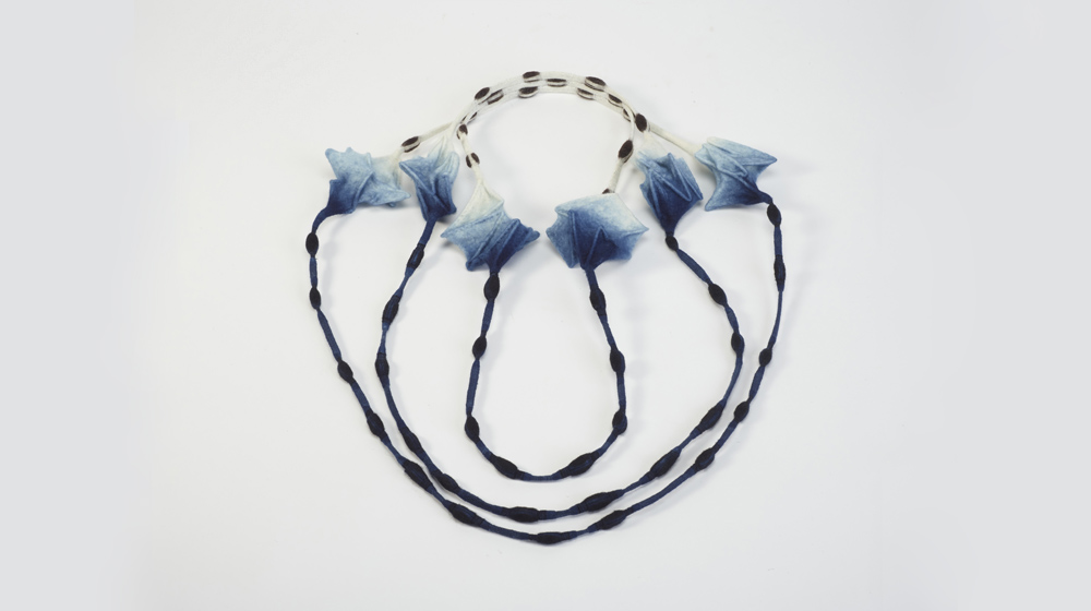 Amo viaggiare e le opportunità che offre: uscire dai luoghi dove mi sento a mio agio, esplorare luoghi e sistemi di organizzazione diversi, e imparare a conoscere altre culture. Dopo avere insegnato ad Anilinas Montblanc a Santiago, ho deciso di trascorrere un po’ di tempo viaggiando da sola nel Cile meridionale, per via dei paesaggi straordinari e l’opportunità di vedere i ghiacciai. Sono stata ispirata dai paesaggi sterminati, perché mi piace sentirmi piccola. Sono stata sopraffatta dal silenzio quando mi sono trovata circondata dal ghiaccio compatto. Lì non c’è aria e quindi meno possibilità di rumore e caos. Mi ha ricordato la pace che trovo nel mio studio quando mi isolo per lavorare. Mi hanno incuriosito la consistenza dei ghiacciai e il loro aspetto blu. Dopo che ho imparato, al Museo Glaciarium di El Calafate, come mai avvengano questi fenomeni, ho creato Fractured Compaction. Ho trovato un’analogia tra il modo in cui una nevicata si compatta in ghiaccio silenzioso e quello in cui le fibre di lana si compattano in feltro isolante. Volevo affrontare il concetto di equilibrio/squilibrio che ho osservato nell’accumularsi della neve e della pressione, e la rimozione attraverso l’evaporazione e lo scioglimento. Volevo anche sperimentare nella creazione di forme affilate e spigolose con il feltro.