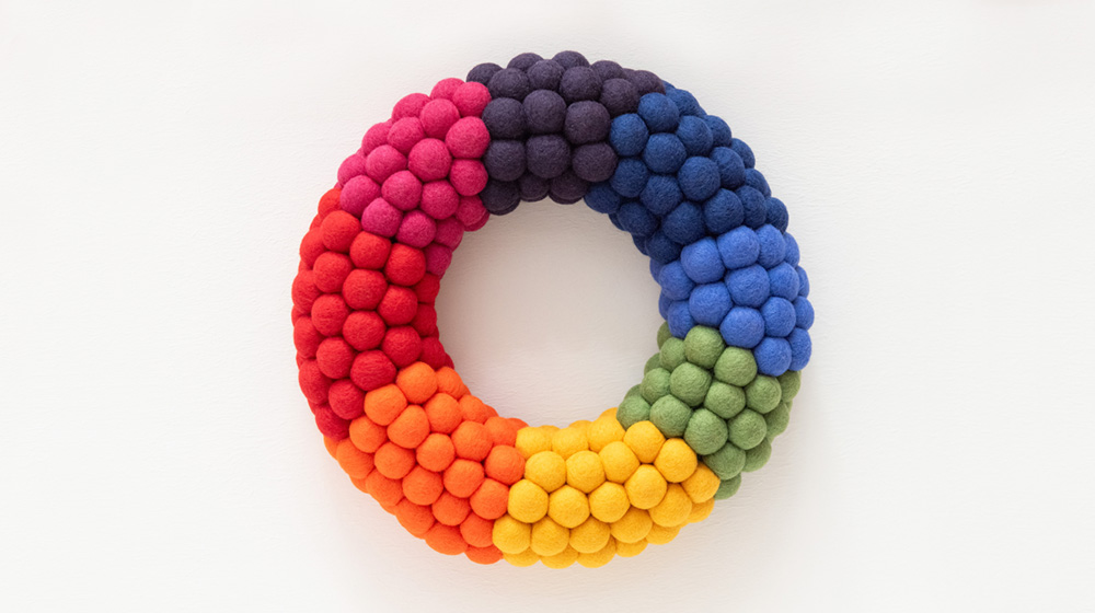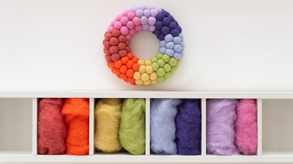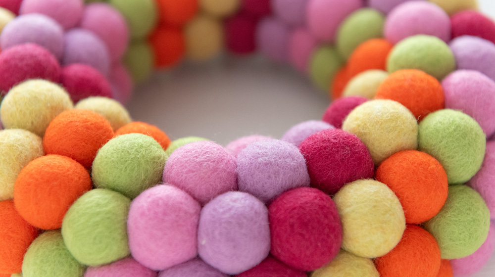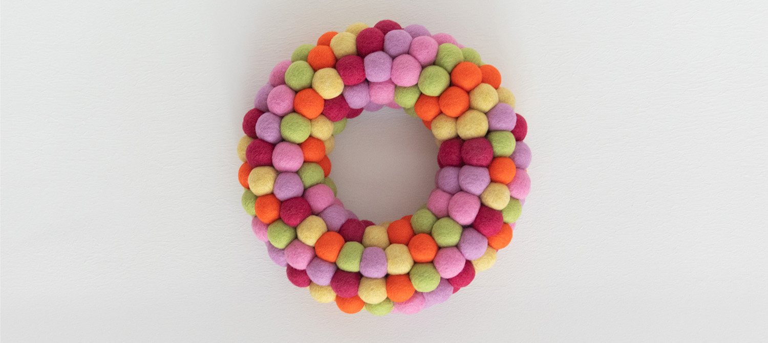 Mi è piaciuto moltissimo lavorare con le fibre DHG, in particolare con il loro blend esclusivo di lane cardate neozelandesi. Con questo blend, studiato appositamente per il feltro ad ago, ho realizzato prima delle palline e poi ghirlande per le porte che vedete qui, super colorate!