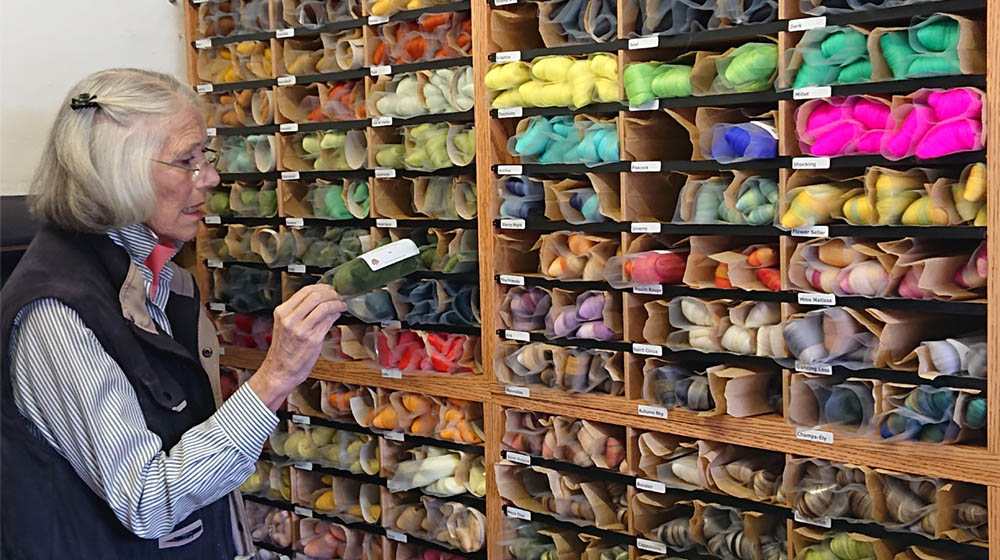 Sono un rivenditore inusuale perché vendo i colori classici DHG assortiti partendo da 5 chili. Quest'offerta è molto popolare tra chi ama il feltro ad ago e i fiber artist perché permette loro di selezionare i colori di cui hanno bisogno per un progetto. Inoltre sono forse l’unica che possiede un gregge di pecore e che vende la loro lana al mercato.