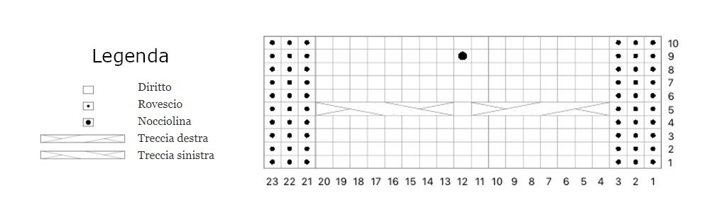 Giro 1: lavorate tutte le maglie a diritto tranne le 23 maglie delimitate dai due segnapunti del motivo centrale, ovvero dello SCHEMA.