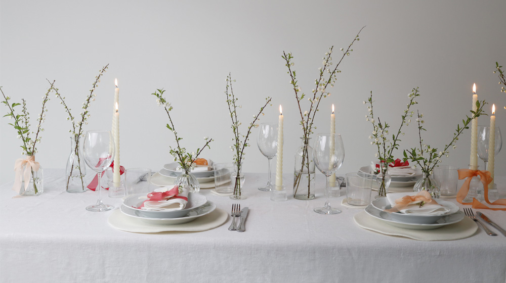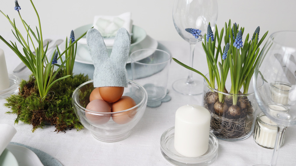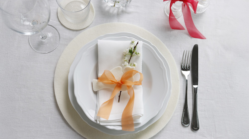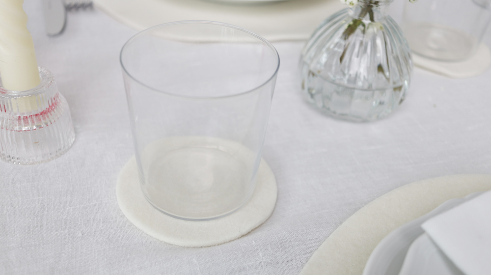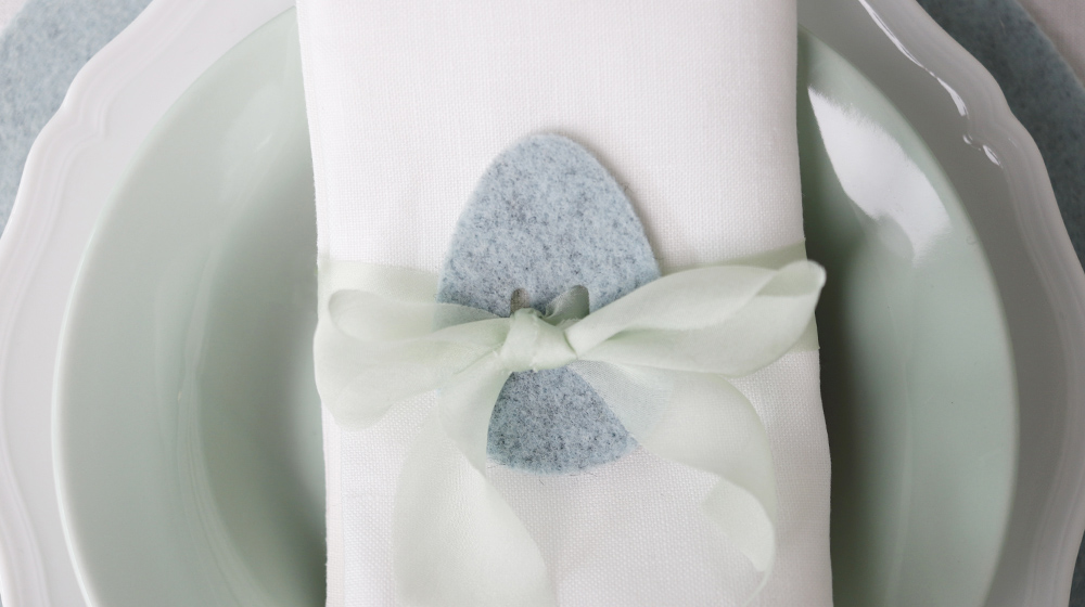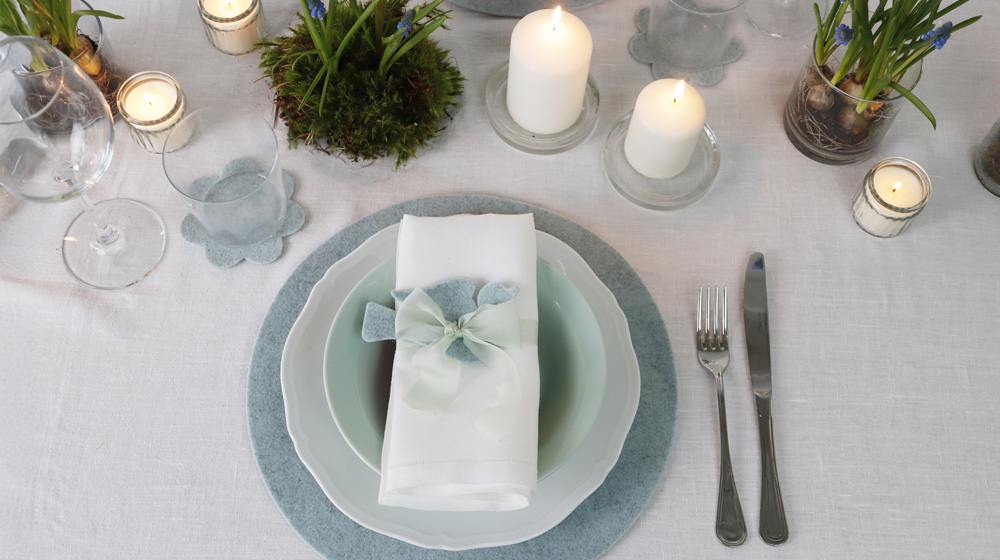 Sottobicchiere tondo, sottobicchiere fiore, sottopiatto tondo, portatovagliolo colomba, portatovagliolo uovo e copri uovo coniglio. Queste le prime decorazioni che potrai acquistare sul nostro shop e che qui vedi utilizzate per 2 mise en place a tema pasquale, una più minimal – elegante e una più country, dove abbiamo combinato decorazioni in feltro e nastri di seta.
