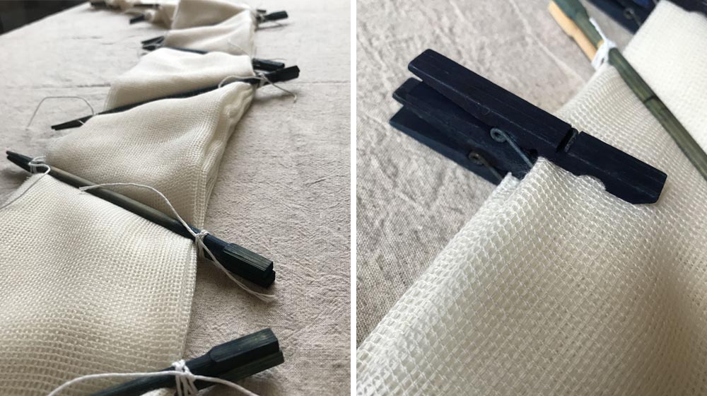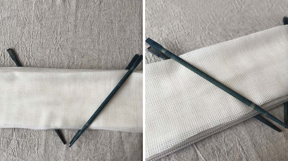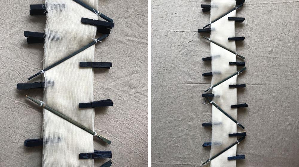 6 Posizionate le bacchette di legno sopra e sotto il tessuto. Legatele poi, molto strette l’una all’altra, con lo spago.