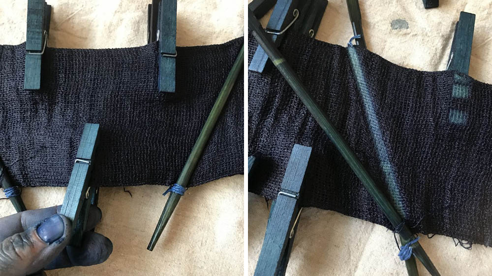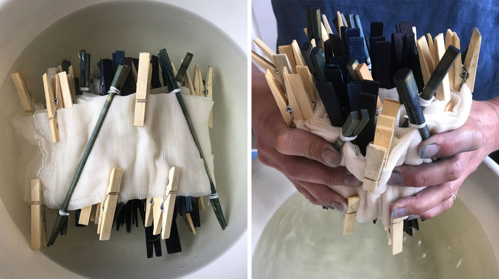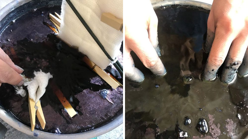 11 Ora avrai ottenuto il colore giallo/verde. Aspetta fino a che il tessuto non diventa completamente blu a contatto con l’ossigeno. Poi fare altri 2 o 3 bagni di indaco di 5 minuti ciascuno.