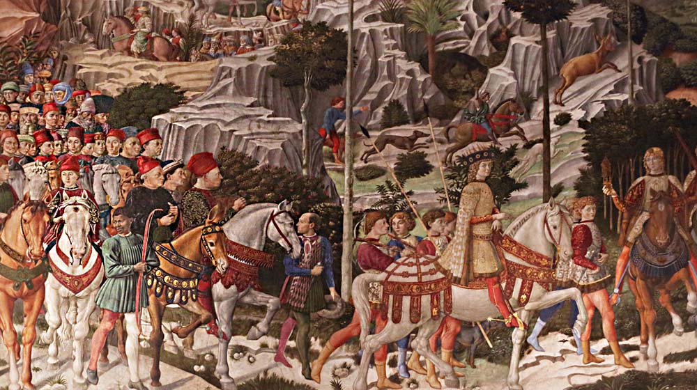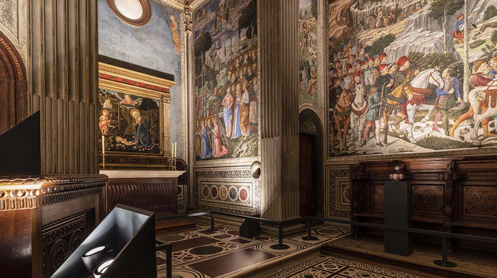 Esempio chiarificatore del loro modus operandi e anche approdo alla notizia di cui abbiamo fatto cenno all’inizio, è la Cappella dei Magi. Stimato ciclo di affreschi e capolavoro di Benozzo Gozzoli accolto al piano nobile Palazzo Medici Riccardi di Firenze. Realizzato nel 1459 illustra la Cavalcata dei Magi ma in realtà immortala un corteo composto da politici e personalità importanti che nell’aprile del 1459 giunse a Firenze dandole lustro. Abbiamo a disposizione un’ulteriore lettura di questa opera. Infatti, fonti certe, ci fanno sapere che particolare attenzione da parte di Benozzo Gozzoli doveva essere data al disegno dei tessuti indossati dai protagonisti. Questo perché i Medici, che possedevano opifici tessili dove producevano preziose stoffe apprezzate in tutta Europa, ambivano quasi certamente ad esporre in questo affresco la loro produzione tessile. Una raffinata e preziosa rappresentazione pittorica come invito alla preghiera ma anche come catalogo commerciale da mostrare agli illustri ospiti di casa Medici. Puro marketing d'avanguardia al servizio dei tessuti Quattrocenteschi.