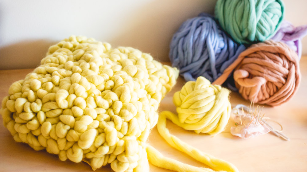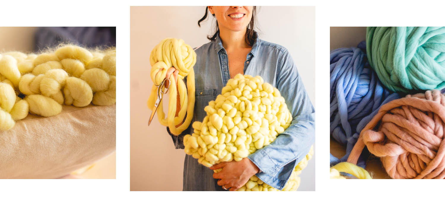 Appena ha avuto sotto mano il nostro filato Giant, saggiandone la consistenza e la potenziale resa, ha subito pensato di creare un cuscino. Non voleva né knittarlo né tesserlo bensė manipolarlo il meno possibile, lasciandone cosė intatte tutte le caratteristiche di voluminositā e morbidezza. Il Giant č un filato incredibilmente pastoso, splendido nella sua semplicitā, se si tiene conto che č un tops di pura lana merino leggermente ritorto. Ha optato quindi per una tecnica di lavorazione vicina al ricamo, ma meno complessa come quella dei nodi. Ha iniziato a piegare il filato, formando dei nodi di misure diverse per poi fissarli al tessuto con un ago. Cosė facendo ha dato vita a un cuscino super chunky dalla superficie disomogenea, dove il protagonista indiscusso č il filato.