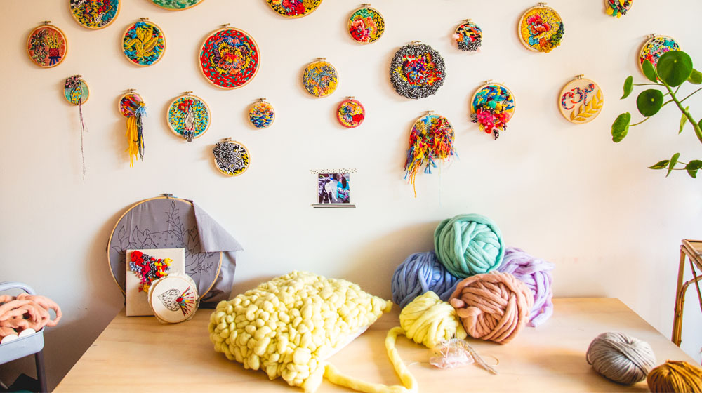 Un giaccone in jeans e un maglione ricamati con temi floreali, utilizzando i nostri filati Sierra, Vintage, Cyrcus e Piuma.