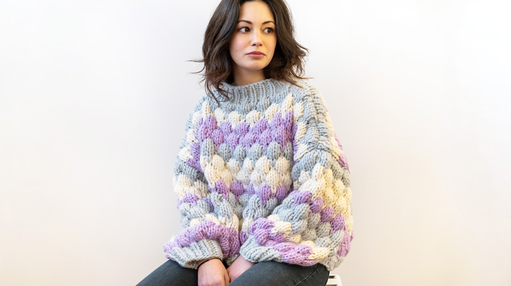 Maglioni di questo tipo, super voluminosi e con un motivo che ricorda tante corpulente bolle di sapone, se ne trovano parecchi ma il nostro maglione bonbon ha una marcia in più che gli altri non possono avere: il filato Piuma.