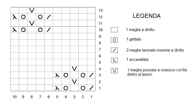 dal giro 63 al giro 75: lavorate 2 maglie a diritto, seguite lo schema dal giro 1 al giro 13 (ripetete 4 volte in orizzontale), finite il giro con 2 diritti