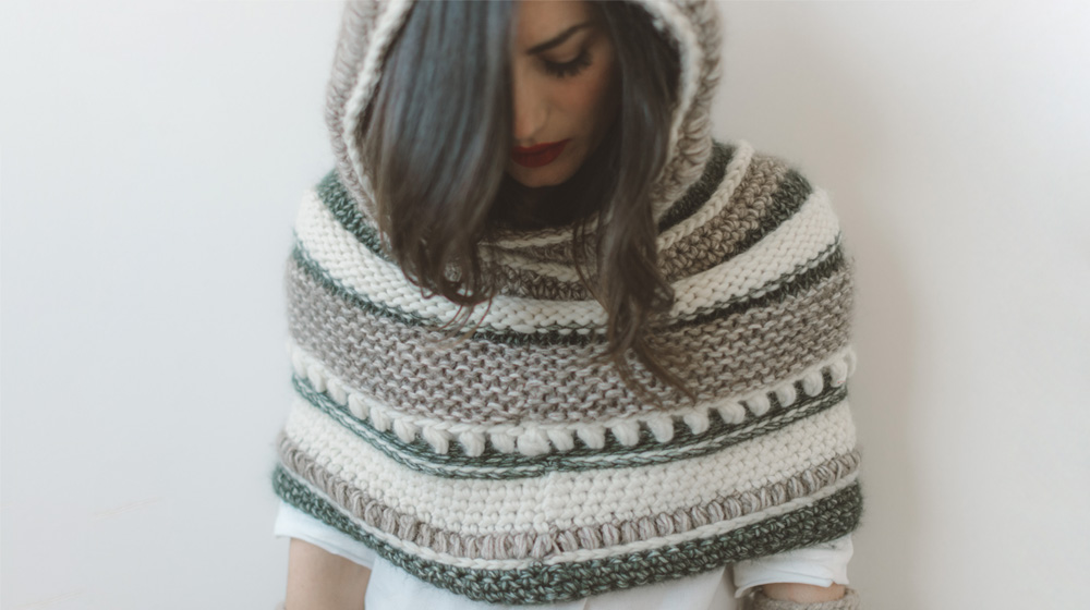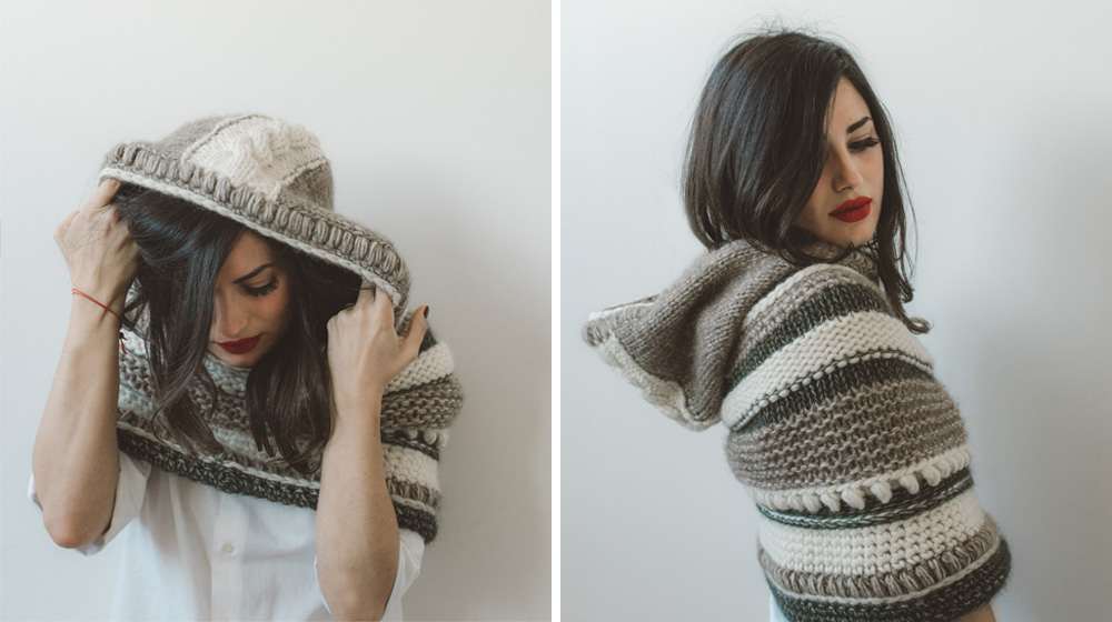 La sciarpa con cappuccio realizzata per noi da Manusa non è sicuramente uno dei progetti più semplici tra quelli proposti fino ad oggi, ma vale la pena armarsi di pazienza e provare a realizzarlo perché il risultato pagherà i vostri sforzi. Garantito.