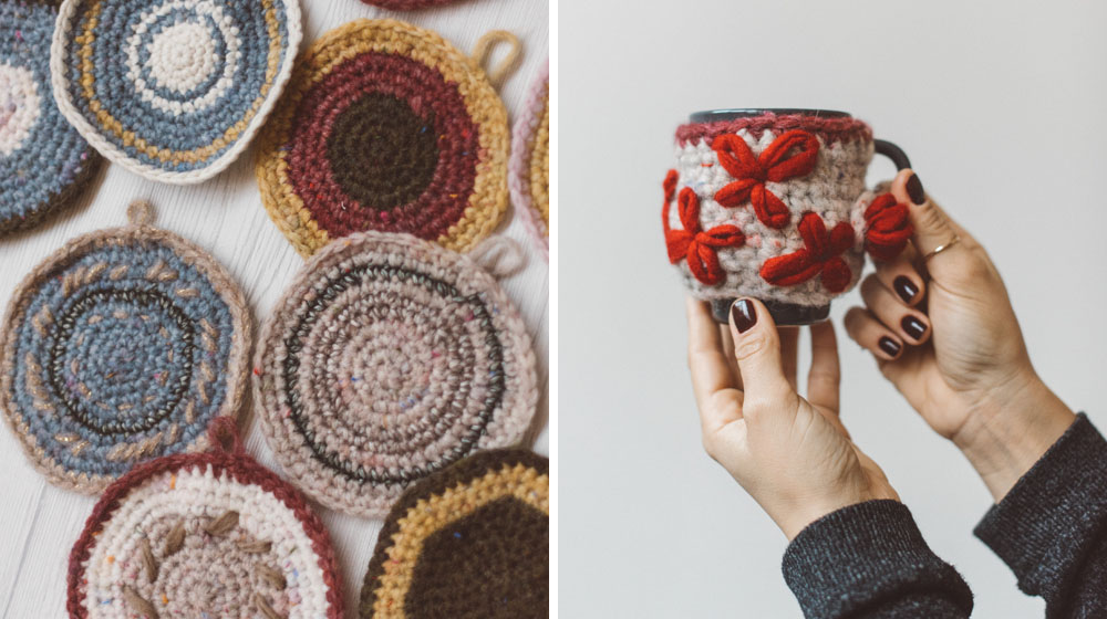 Ci siamo inventati delle presine e dei copritazza all'uncinetto che secondo noi offrono un modo davvero intelligente di utilizzare i materiali che vi avanzano dai vostri lavori.