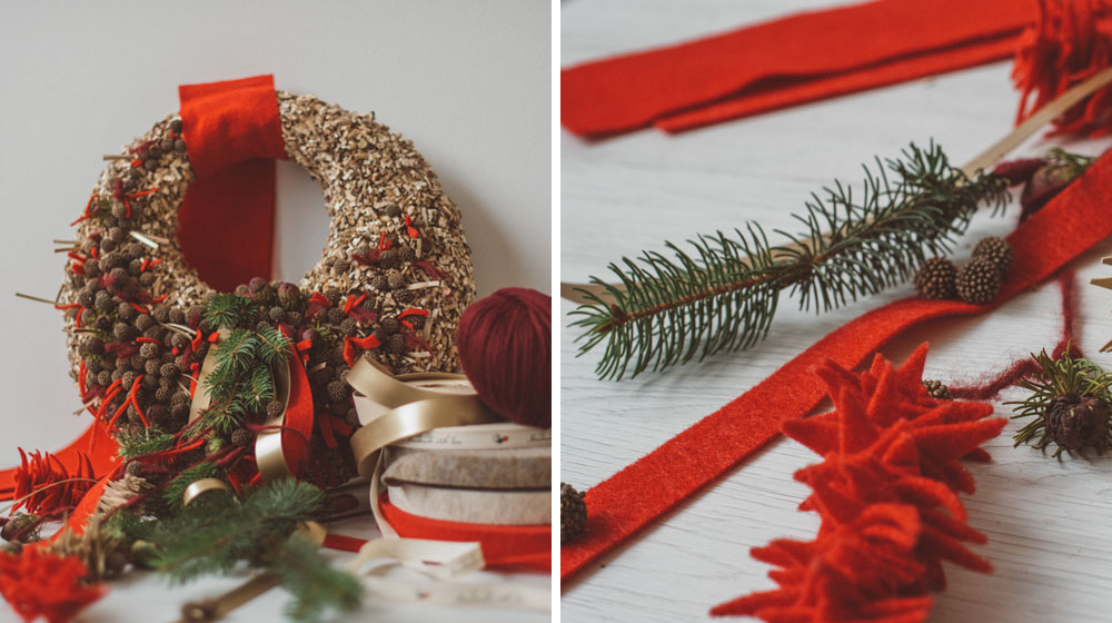 Una base in legno e tanta fantasia. Rami di abete, bacche, filati e nastri in feltro e finta pelle.