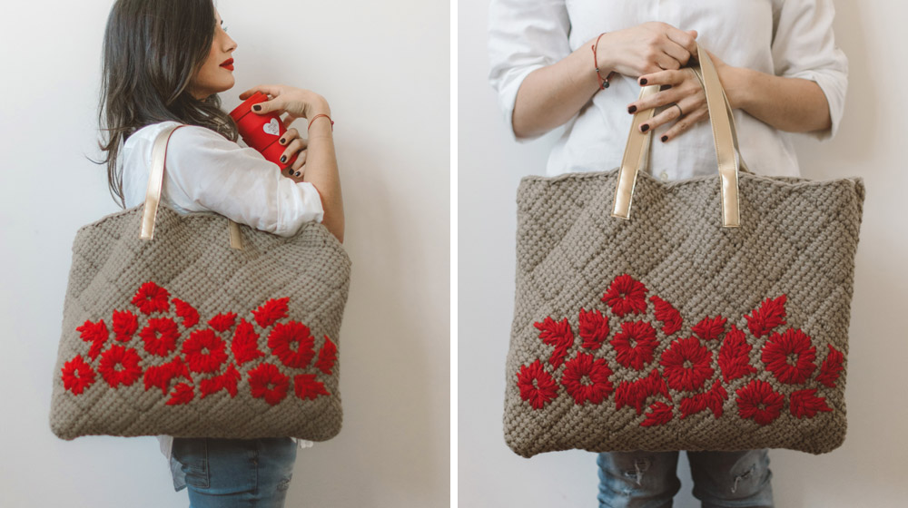 Stesso materiale e stessa tecnica per un progetto dallo stile completamente diverso grazie anche all'aggiunta di dettagli ricamati a contrasto, realizzati sempre utilizzando i nastri di prefeltro merino extrafine. I manici sono stati creati con i nastri di finta pelle deluxe.