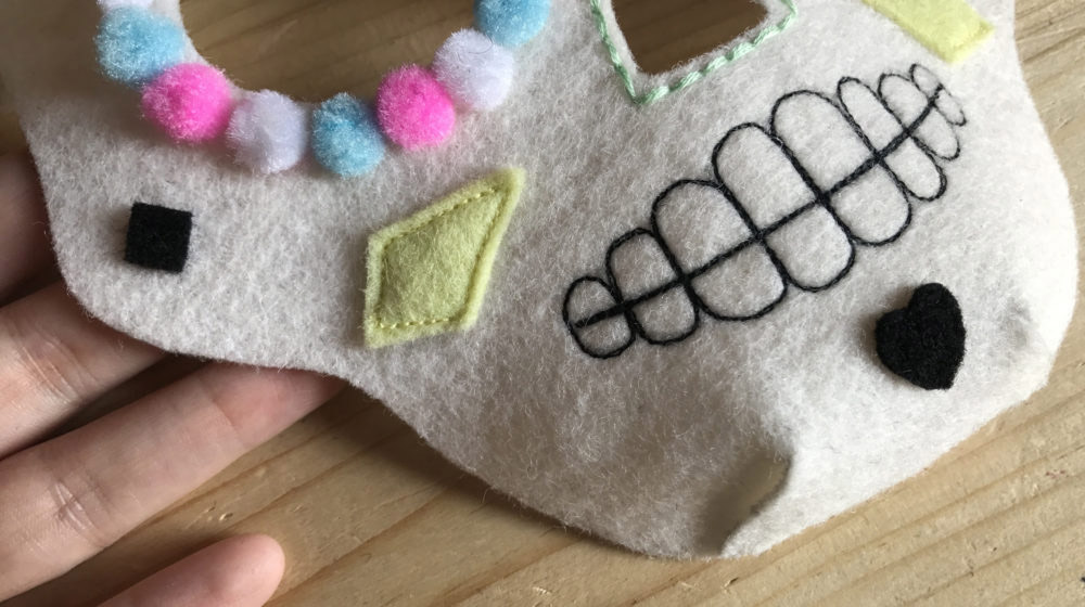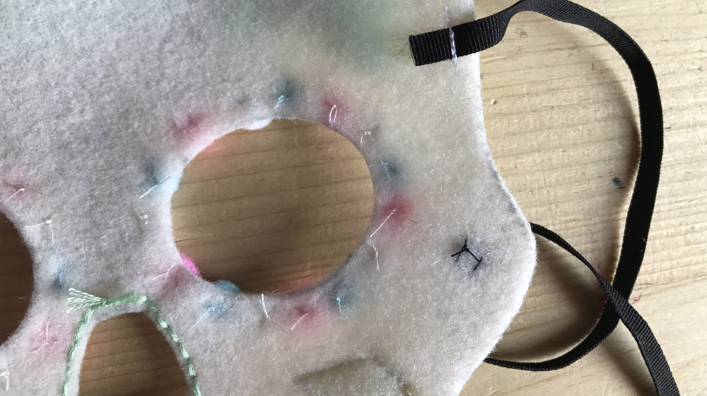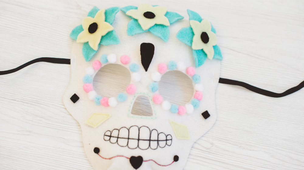 Самый последний шаг: пришейте с двух сторон черепа две чёрные ленты grosgrain шириной 0.5 см и маска готова!
