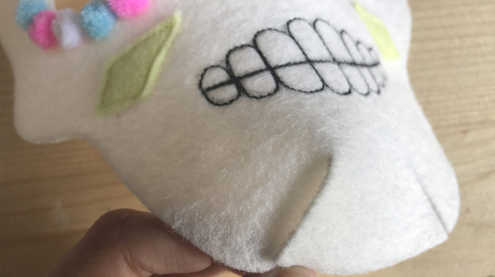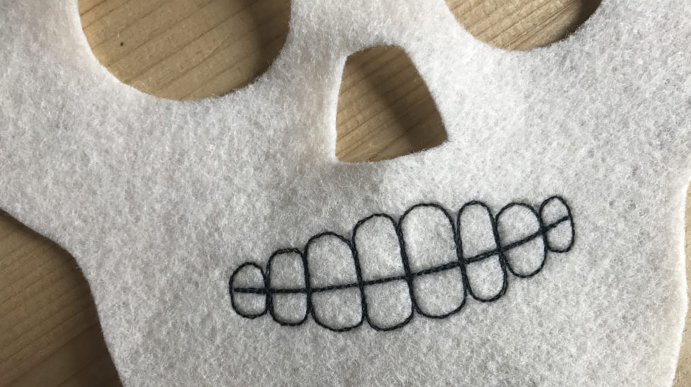 Приступаем к рту: нарисуйте на фетре "улыбку черепа" и зубы и на швейной машинке чёрной ниткой обведите контуры.