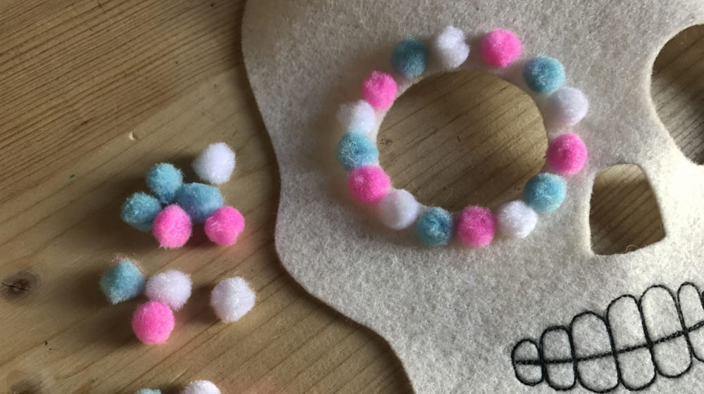 Возьмите помпоны и зафиксируйте каждый швом вокруг глаз.