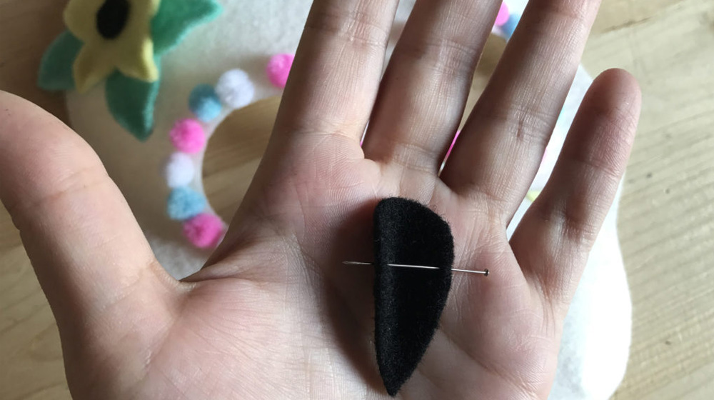 Воспользуйтесь термопластичностью фетра, чтобы сделать лепесток из чёрного фетра, сложив его пополам и зафиксировав булавкой. Выпекать несколько минут при температуре 130° .
