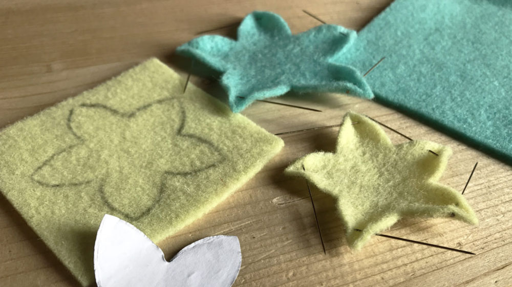 Вырежьте 6 цветов: 3 из фетра цвета Антильские Острова и 3 поменьше из фетра цвета Свет.