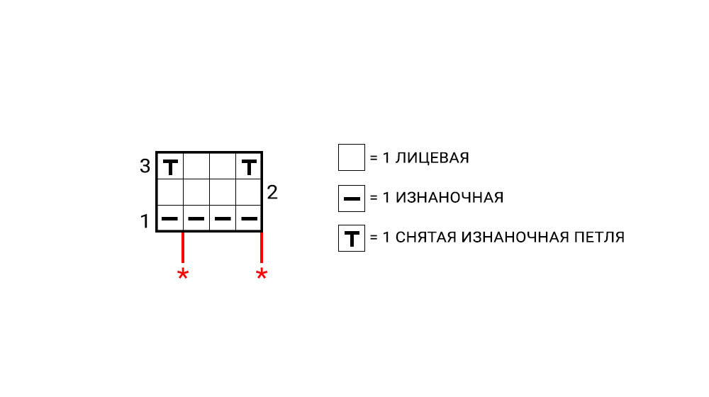 Ряд 1 провязывается с обратной стороны вязки: все петли изнаночными