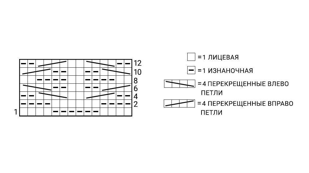 ряд 12: провяжите 2 изнаночные, 4 перекрещенные влево, 2 лицевые, 4 перекрещенные вправо, 2 изнаночные