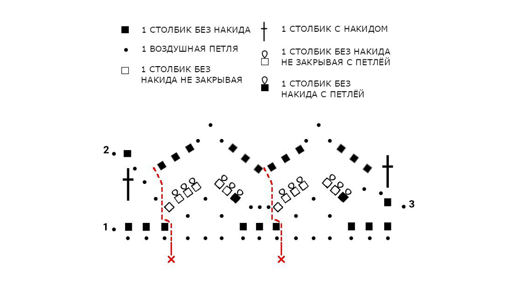 1-ряд: (выполняется на обратной стороне изделия): 1 воздушная петля (не заменяет начальный столбик без накида), пропустить 1 воздушную петлю на крючке, 1 столбик без накида в следующих 3-х воздушных петлях, *3 воздушные петли, пропустить 3 воздушные петли, 1 столбик без накида в следующих 3-х воздушных петлях, * повторять всегда от * до *.