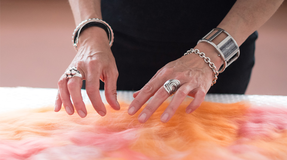 - Научитесь аккуратно раскладывать шерсть небольшими одинаковыми кусочками, избегайте создания неравномерных зон (плотные - редкие). По началу будет непросто, но со временем, если работать старательно, у вас будет получаться натурально. Как и с кардочесом, не забывайте изменять направление волокон, чередуя слоя: если вы начали раскладывать вертикально, то второй слой раскладывайте горизонтально.
