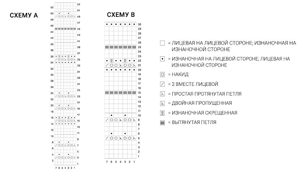 Изнаночная сторона изделия: СХЕМА A (7 петель), 1 чулочная, 5 платочных.