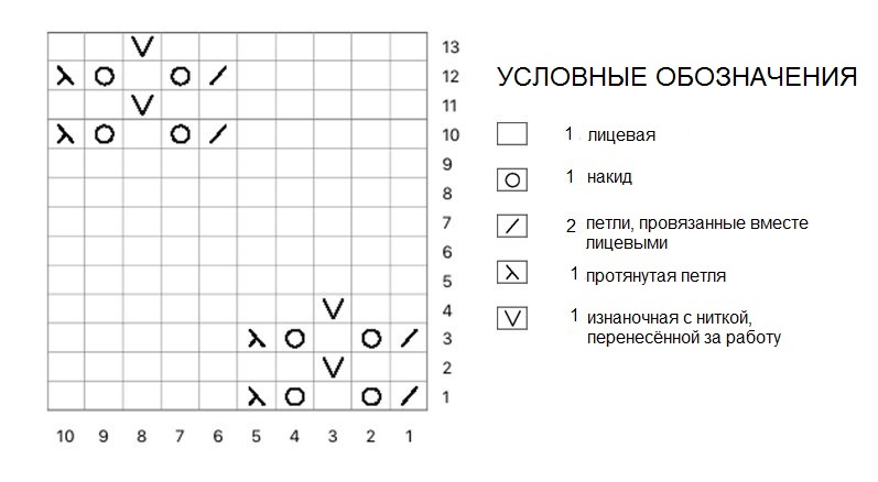 с 25 по 37 круг: 4 лицевые, строчки схемы с 1 по 13 (необходимо повторить 4 раза горизонтально), закройте круг 4-мя лицевыми