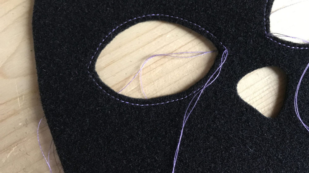 На швейной машине фиолетовой ниткой прострочите контуры глаз, оставив 2/3 мм с края.