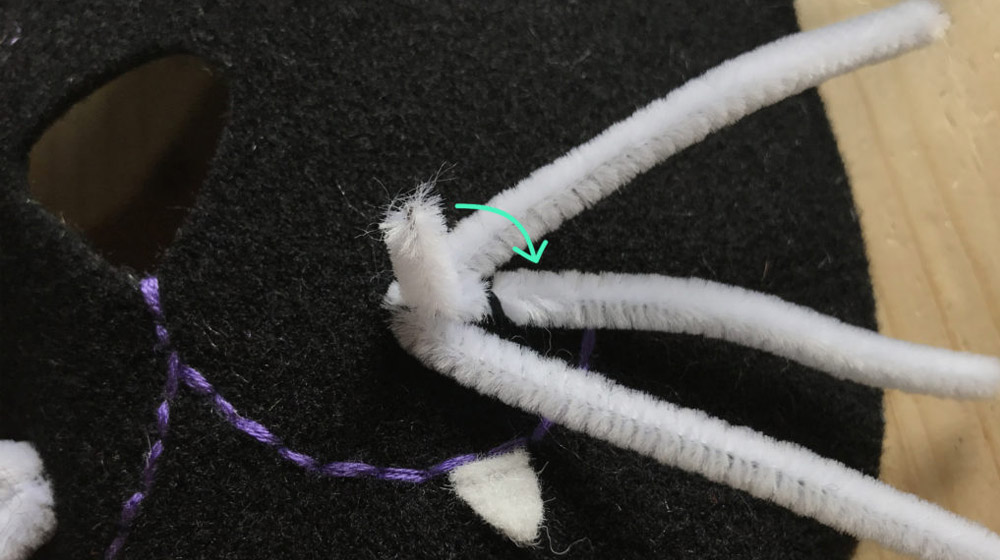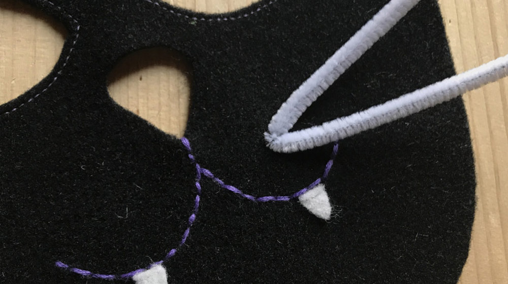 Сложите пополам длинные ёршики и пришейте к маске чёрной ниткой на складке.