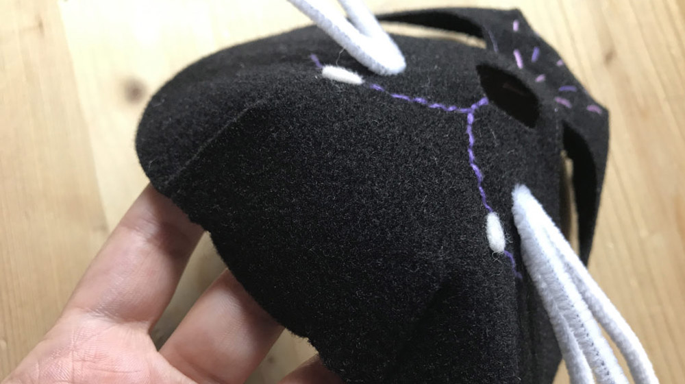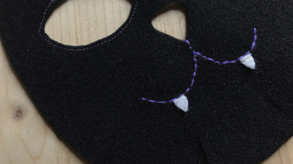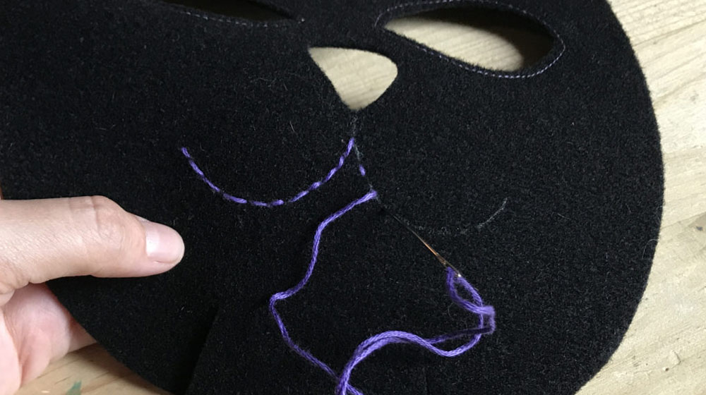 Теперь осталось немного раскрасить вашу маску. Pollaz, к примеру, решила вышить небольшие стежки, используя контрастные цвета (фиолетовый и лиловый).