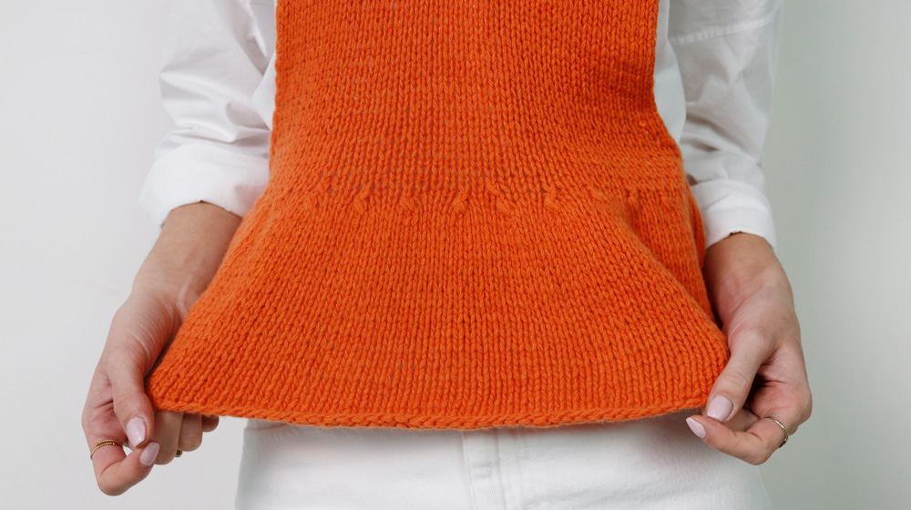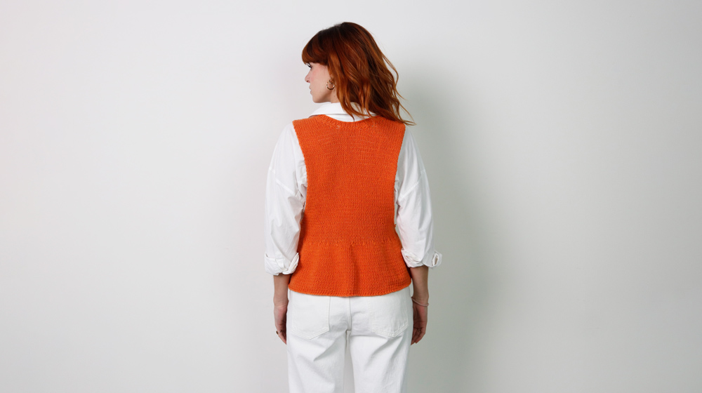 Топ вяжется прямыми рядами и состоит из двух деталей – переда и спинки, которые затем сшиваются по бокам.