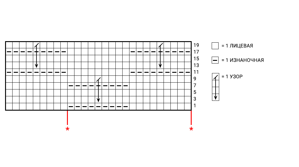 Повторять от * до * до конца ряда и завершить петлями после второй *. В чётных рядах, неотмеченных на схеме, провязать все петли такими, как есть, лицевые на лицевых и изнаночные на изнаночных.