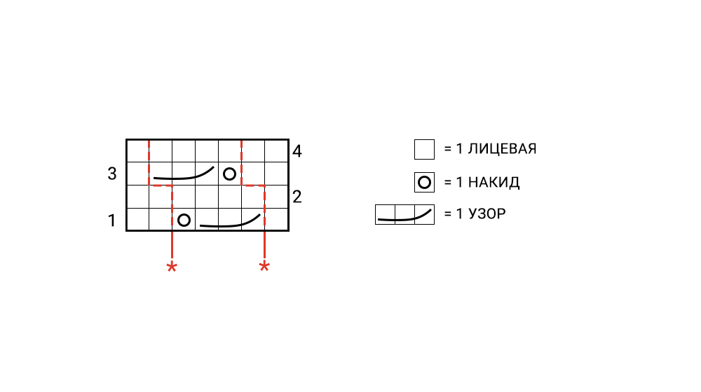 Начинайте с петли до первой *, первая красная пунктирная линия, повторяйте от * до * до конца ряда и завершите петлями после второй*, вторая красная пунктирная линия.
