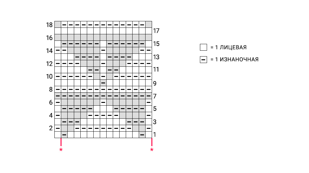 Повторяйте от * до * до конца ряда и завершите петлёй после второй *. Серые квадратики представляют участки, провязываемые перевёрнутой лицевой гладью, а белые - лицевой гладью.