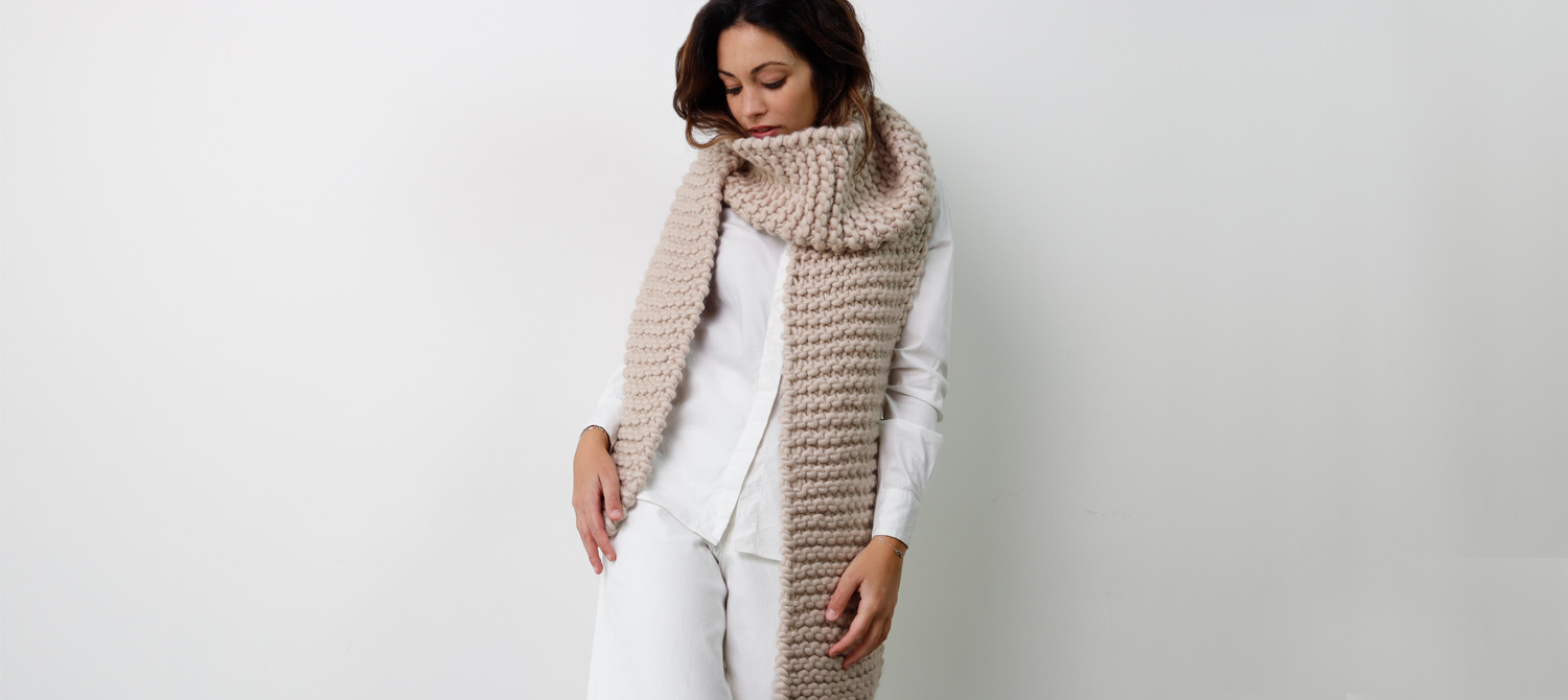 Макси-шарф спицами, который мы предлагаем, связан из нашей пряжи Piuma XXL, супер объёмной пряжи, полученной благодаря полуремесленному процессу прядения в Италии. Состав пряжи — 100% шерсть мериноса экстрафайн.