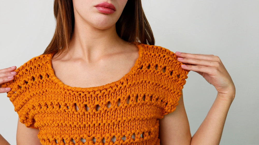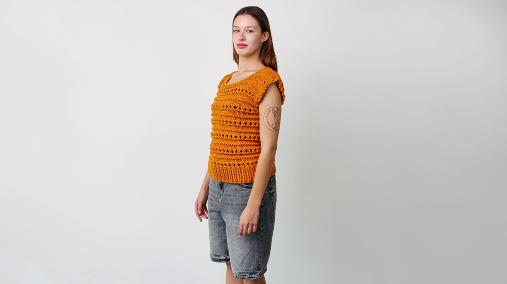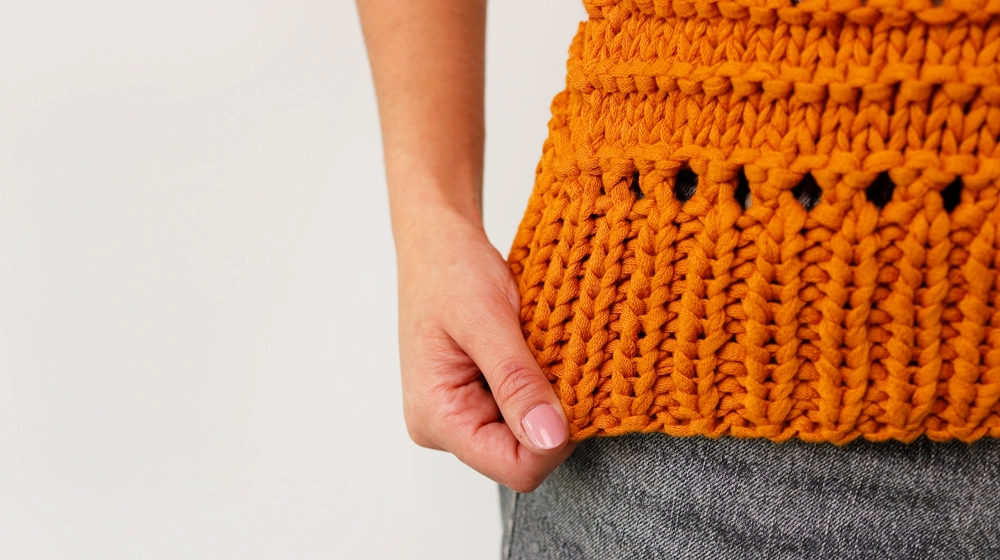 Сегодня мы свяжем топ с ажурной полосой. Этот приём не только создаёт красивый «арабеск» по всему топу, но и особенно хорошо смотрится с чуть более толстой пряжей, которая помогает лучше выделить рисунок. Именно поэтому для модели выбрана лента из 100% хлопка Stromboli, очень объёмная и плотная. В результате получается идеальное сочетание.