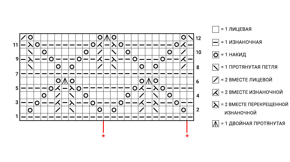 Начинайте с петли до первой звёздочки, повторяйте от * до * до конца ряда и завершите петлями после второй звёздочки.