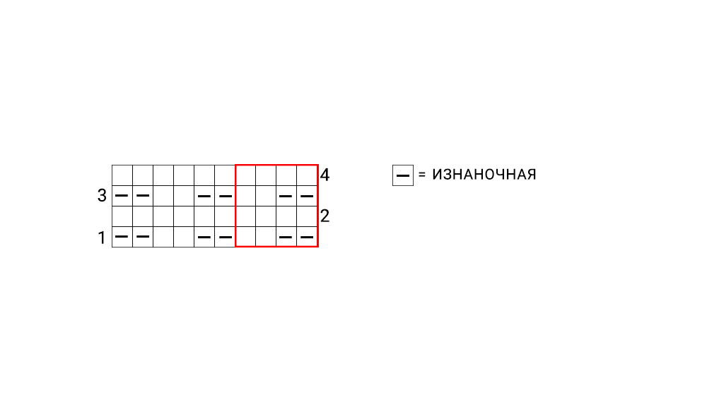 Ряд 1, изнаночная сторона: *2 изнаночными и 2 лицевыми*, повторить от * до * до конца ряда, завершить 2 изнаночными, перевернуть