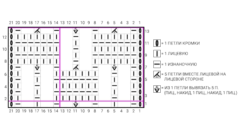 Провяжите 1 раз с 1 по 13 ряды, затем повторяйте со 2 по 13 ряды.