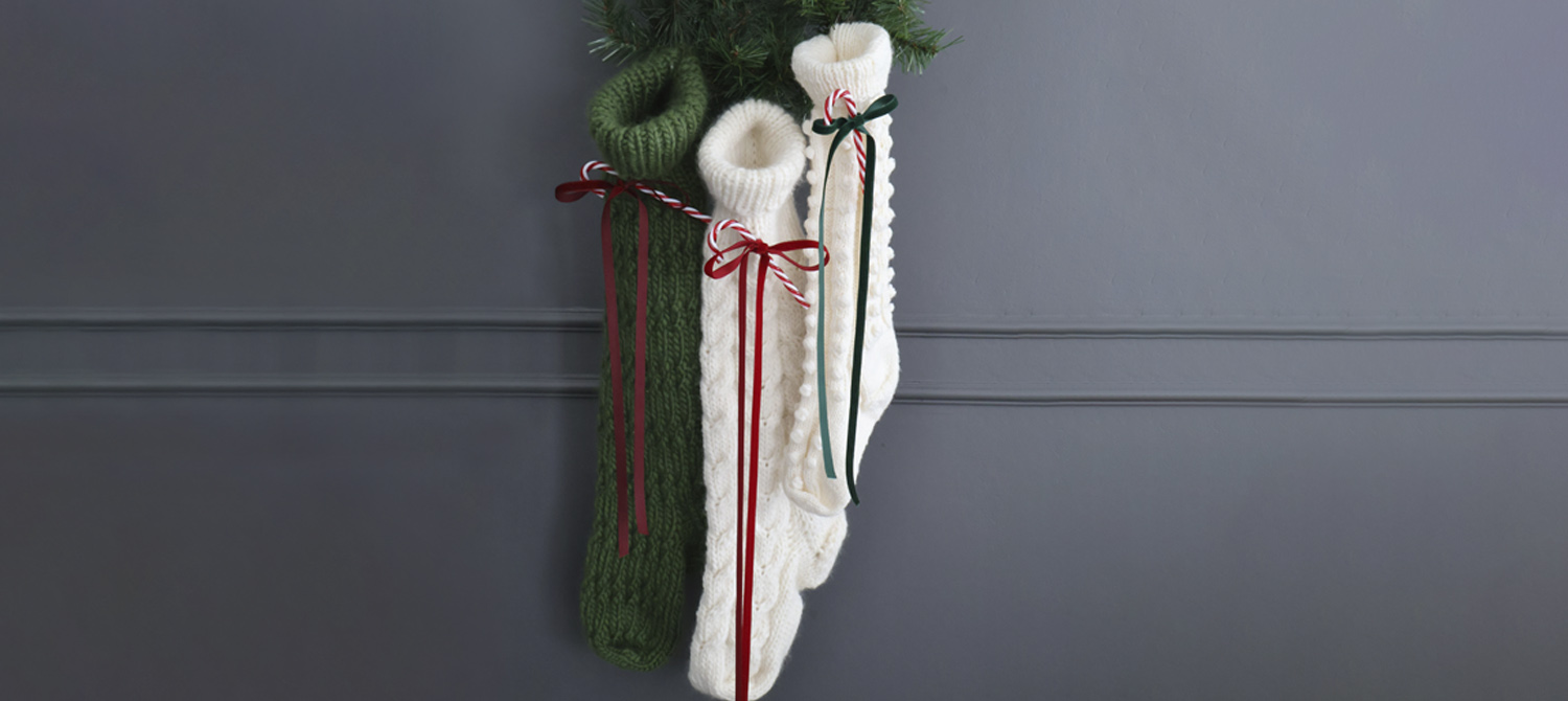 Сегодня мы предлагаем вам три разных схемы для вязания рождественских носков спицами. Два из них выполнены из пряжи Piuma, один — из пряжи Rain or Shine, обе — из чистой мериносовой шерсти. Вы можете повесить их под ёлку, у камина или у изголовья кровати. Они подойдут как для малышей, так и для взрослых, ведь в некоторых вещах мы остаёмся детьми навсегда! В носки можно положить игрушки, сладости и всё, что хочется подарить, главное — чтобы не было слишком объёмно.