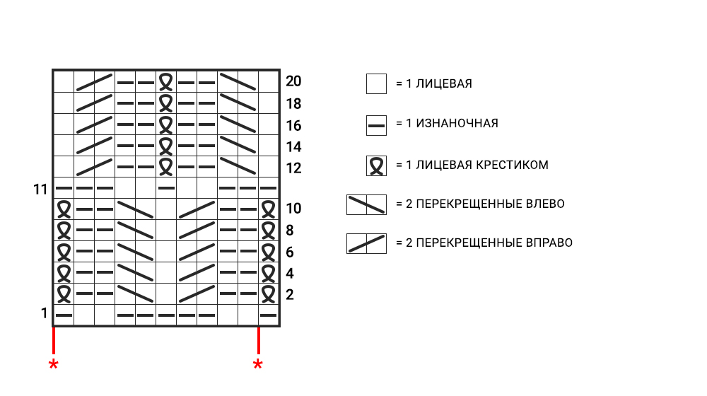 ряды 12, 14, 16, 18, 20: 1 лицевая, *2 перекрещенные влево, 2 изнаночные, 1 лицевая крестиком, 2 изнаночные, 2 перекрещенные вправо, 1 лицевая *