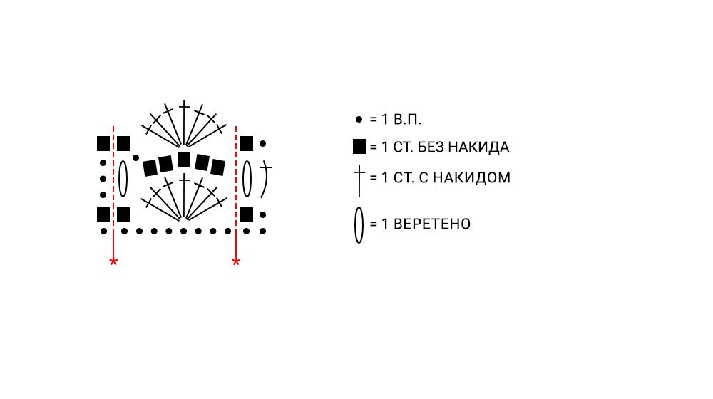 ряд 2: провяжите 3 воздушные петли, *1 веретено [(1 накид на крючок, вставить крючок в нижний столбик без накида, 1 накид на крючок и вытянуть нить, вытянуть петлю на крючке до высоты предыдущего столбика с накидом), повторите часть в круглых скобках ещё 3 раза, 1 накид и закройте все петли на крючке одним разом, 1 воздушная петля, чтобы закрыть веретено], 1 воздушная петля, пропустите 1 столбик с накидом, 1 столбик без накида в каждой из последующих 5 петель, 1 воздушная петля, пропустить 1 столбик с накидом*, завершите 1 веретеном, 1 столбик с накидом в последней петле