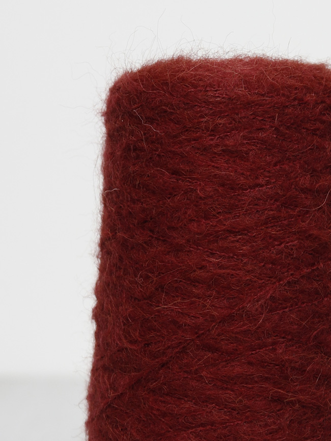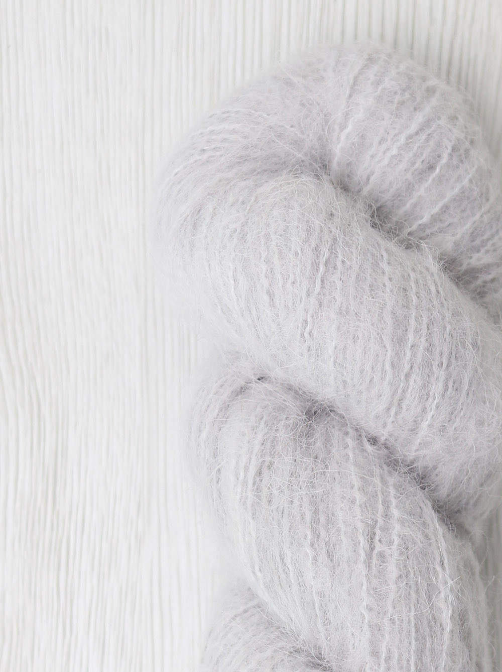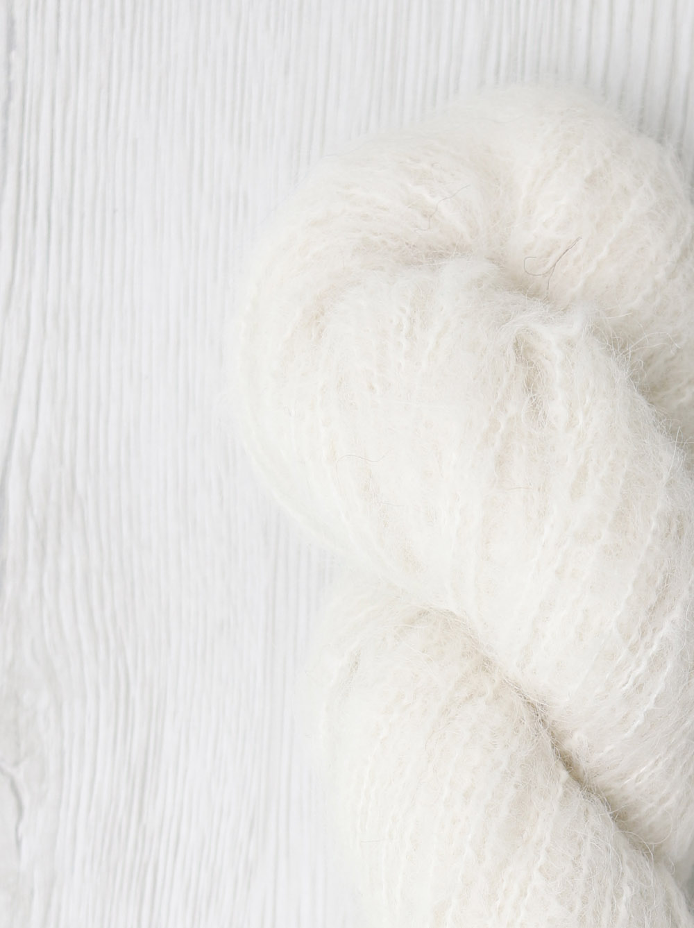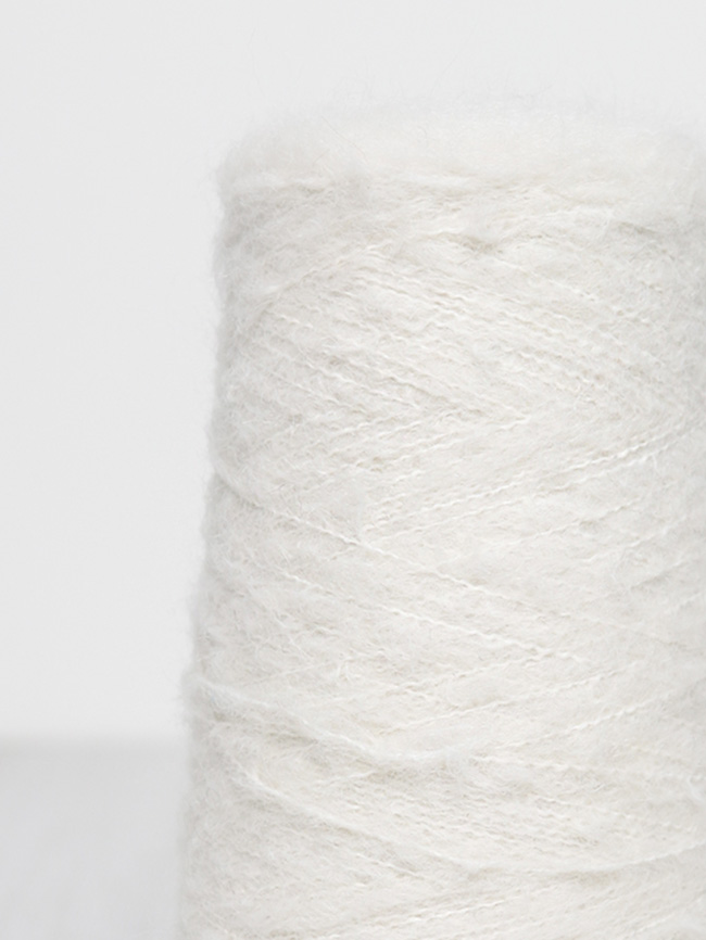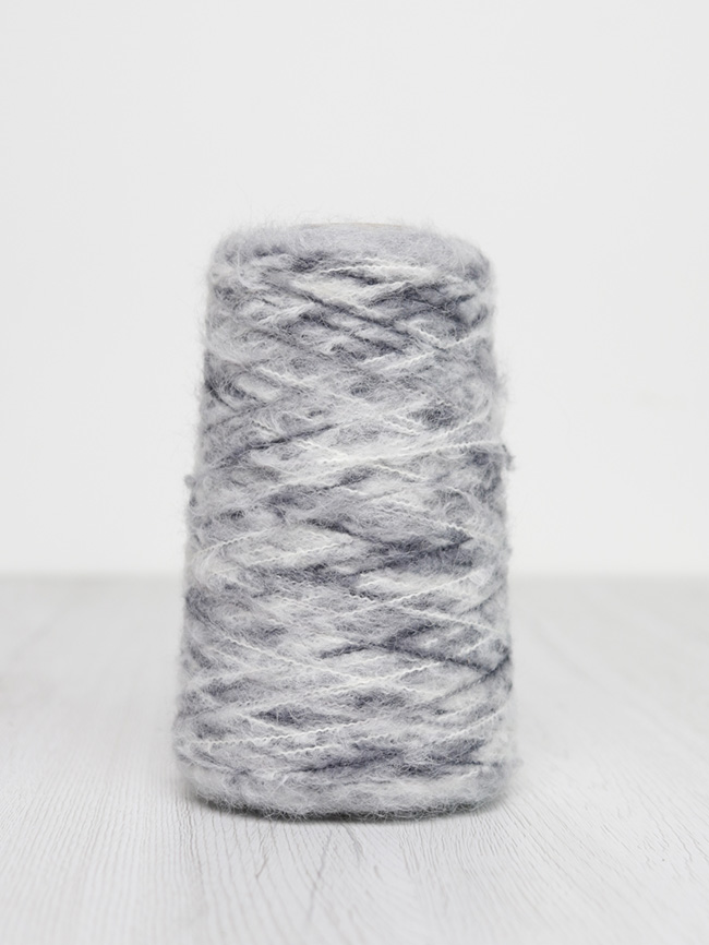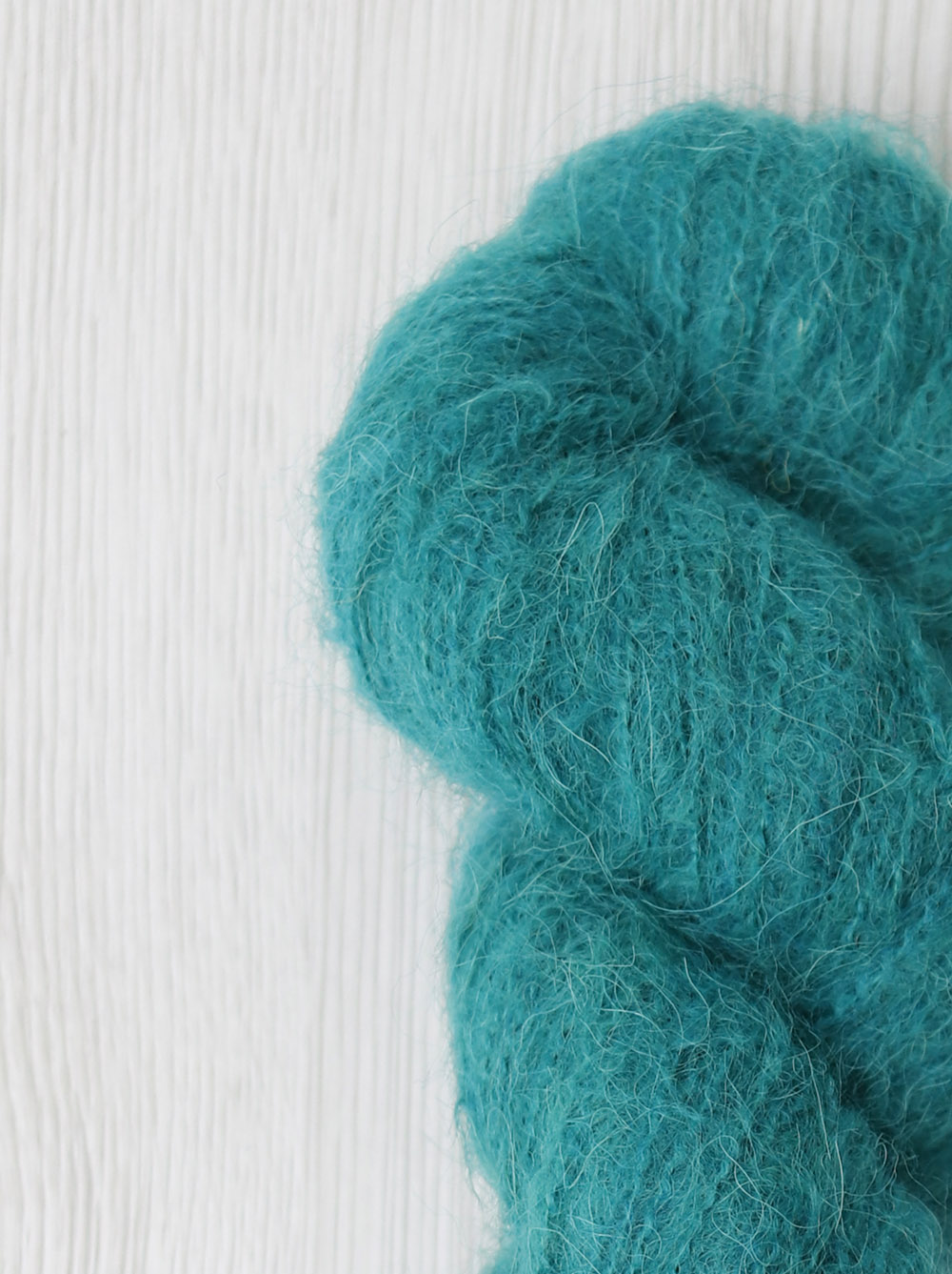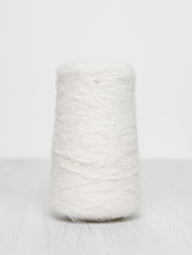 Cumbria is an alpaca yarn crafted from three twisted strands. Two ultrafine threads form the core, while a third, super-thin, fuzzy, and almost ethereal strand adds a voluminous, cotton-candy-like texture. This third alpaca strand determines the varying thickness of the entire yarn, depending on the concentration of its fluffy component. The resulting yarn has a firm structure but is also soft, thanks to the natural suppleness of alpaca fibers. Its slightly irregular volume, silky texture, and smooth glide make it a pleasure to work with.
